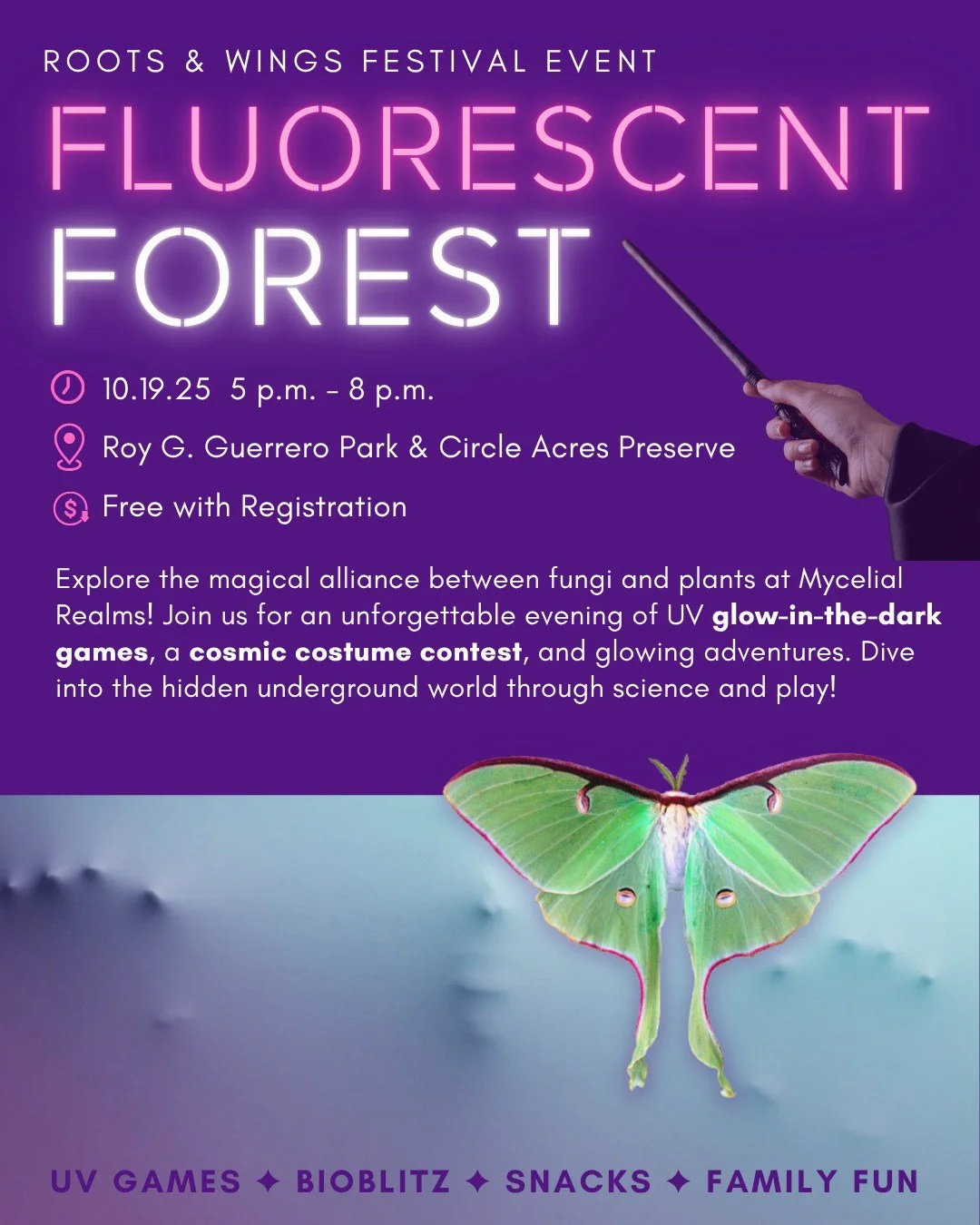 Join our friends at Ecology Action for an evening of family friendly, fungal fun as the Circle Acres Preserve in East Austin will be transformed into a Fluorescent Forest for Roots & Wings Festival.