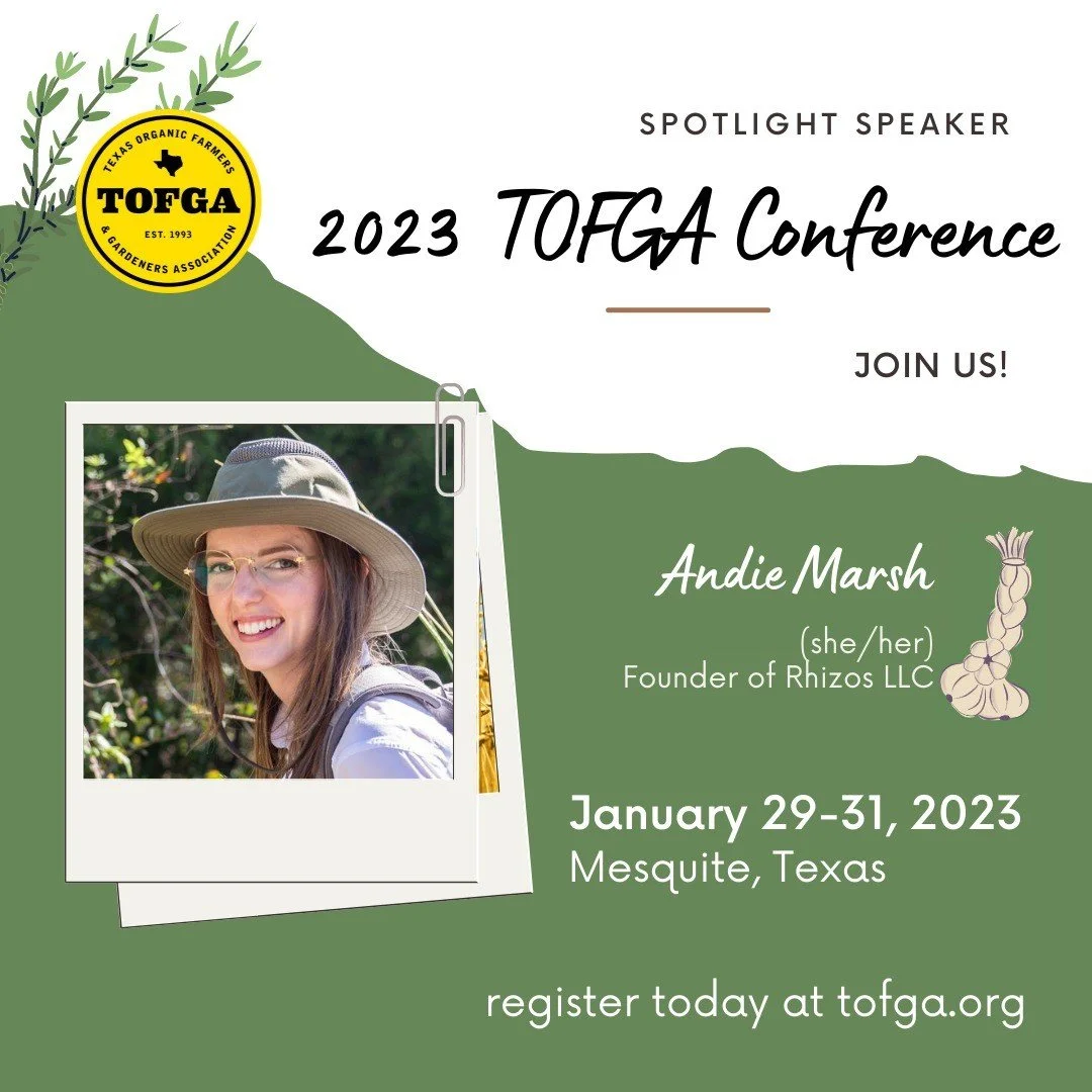 We will be at the Texas Organic Farmers & Gardeners Conference (TOFGA) again this year in Mesquite, Texas. You can buy day passes or passes for the entire conference. Join Angel from Central Texas Mycological Society and Andi Marsh from Rhizos Science to learn about mycology and soil.
