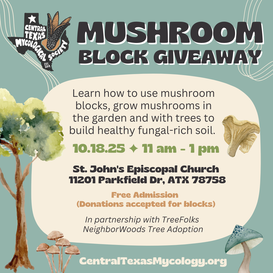 We will be at the St. John's Episcopal Church with TreeFolks giving away mushroom blocks and trees! Come learn how to use mushroom blocks to help your trees thrive!