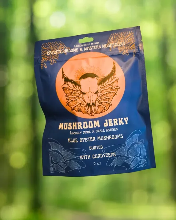Blue Oyster Mushroom Jerky Dusted with Cordyceps from Cap City Shrooms & Masters Mushrooms