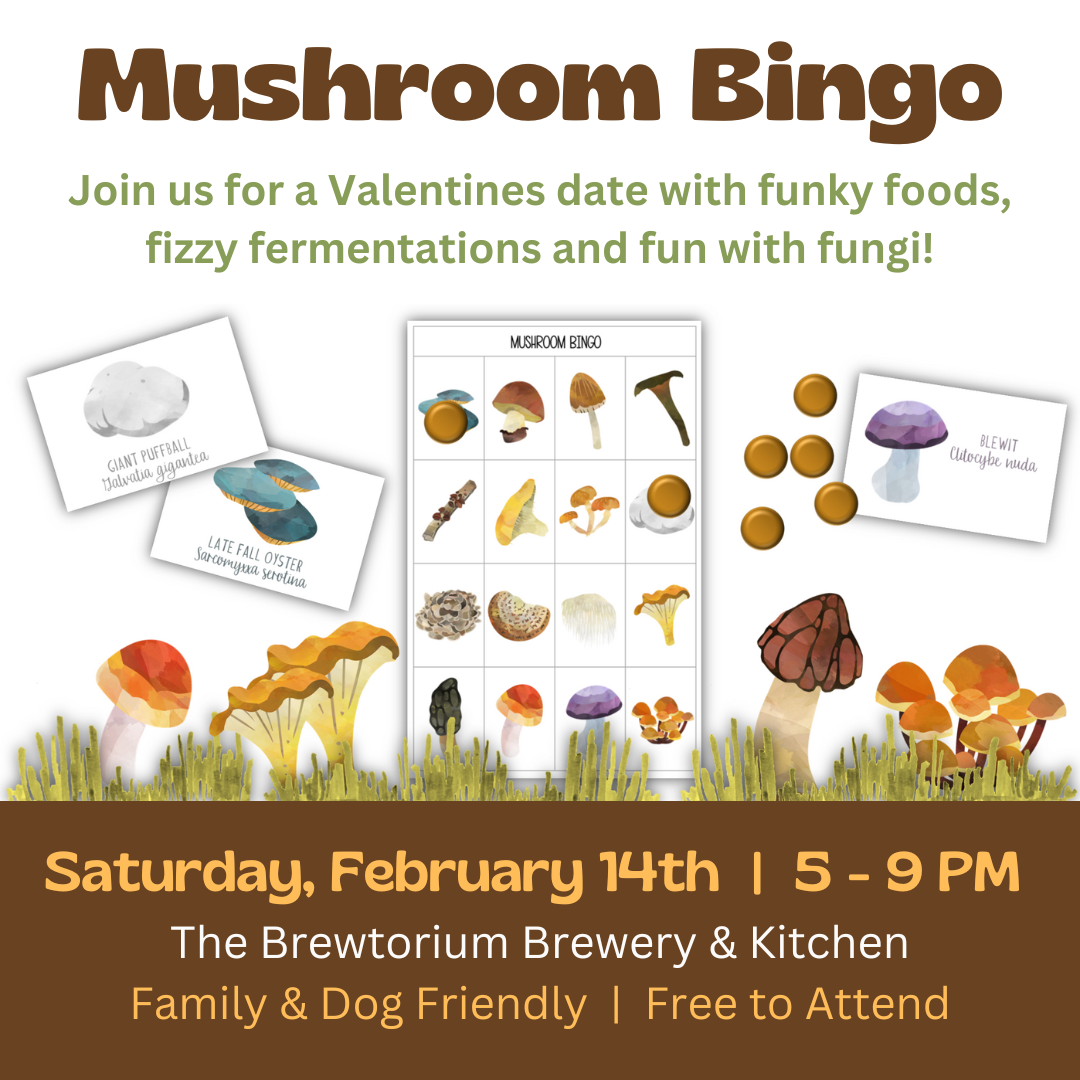 🥨 Delicious food specials using fermented ingredients paired with house beers! 🍄 Mushroom Bingo + great prizes! 💗 Fun Valentines activities 💚Take home your own mushroom block to grow your own funky fungi at home!