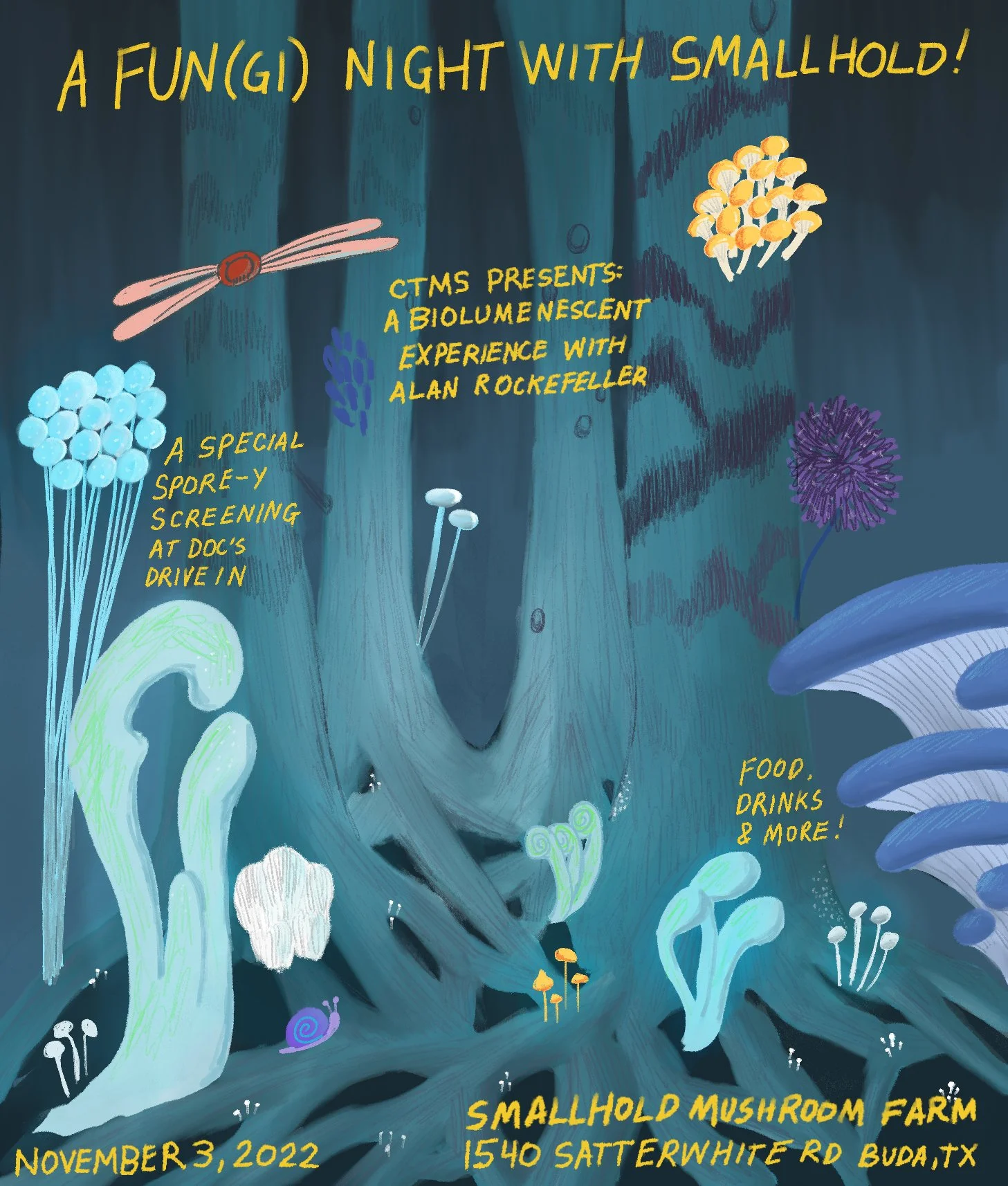 Join us for A bioluminescent experience with Alan Rockefeller. Special spore-y screening, Mushroom BBQ from Millscale, Drinks, microscopy in the speakeasy.